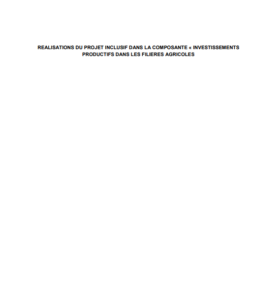 Ce manuel est élaboré pour servir de cadre de référence à la mise en œuvre efficace et efficiente des activités du projet INCLUSIF. Réalisations du Projet Inclusif dans la composante « INVESTISSEMENTS